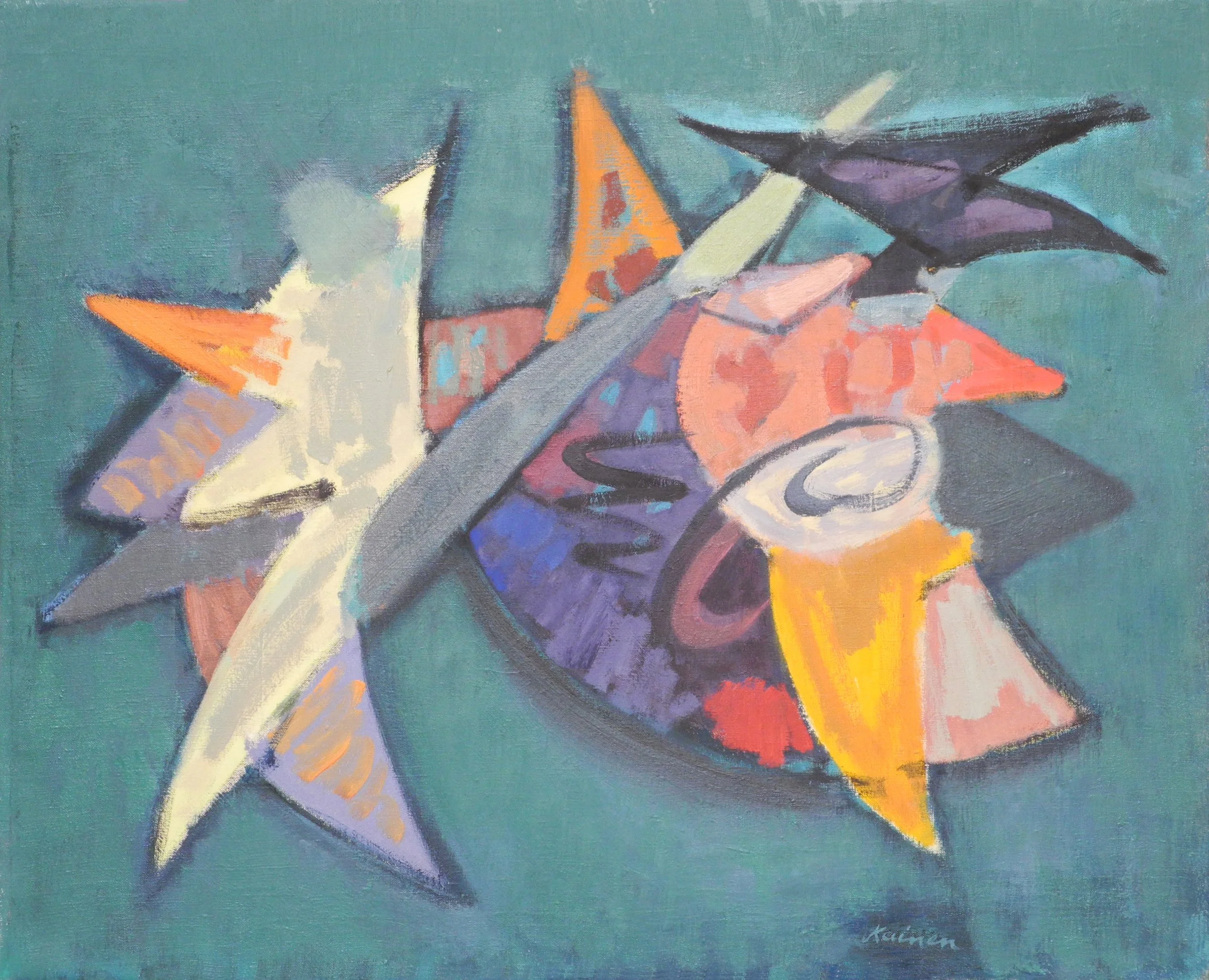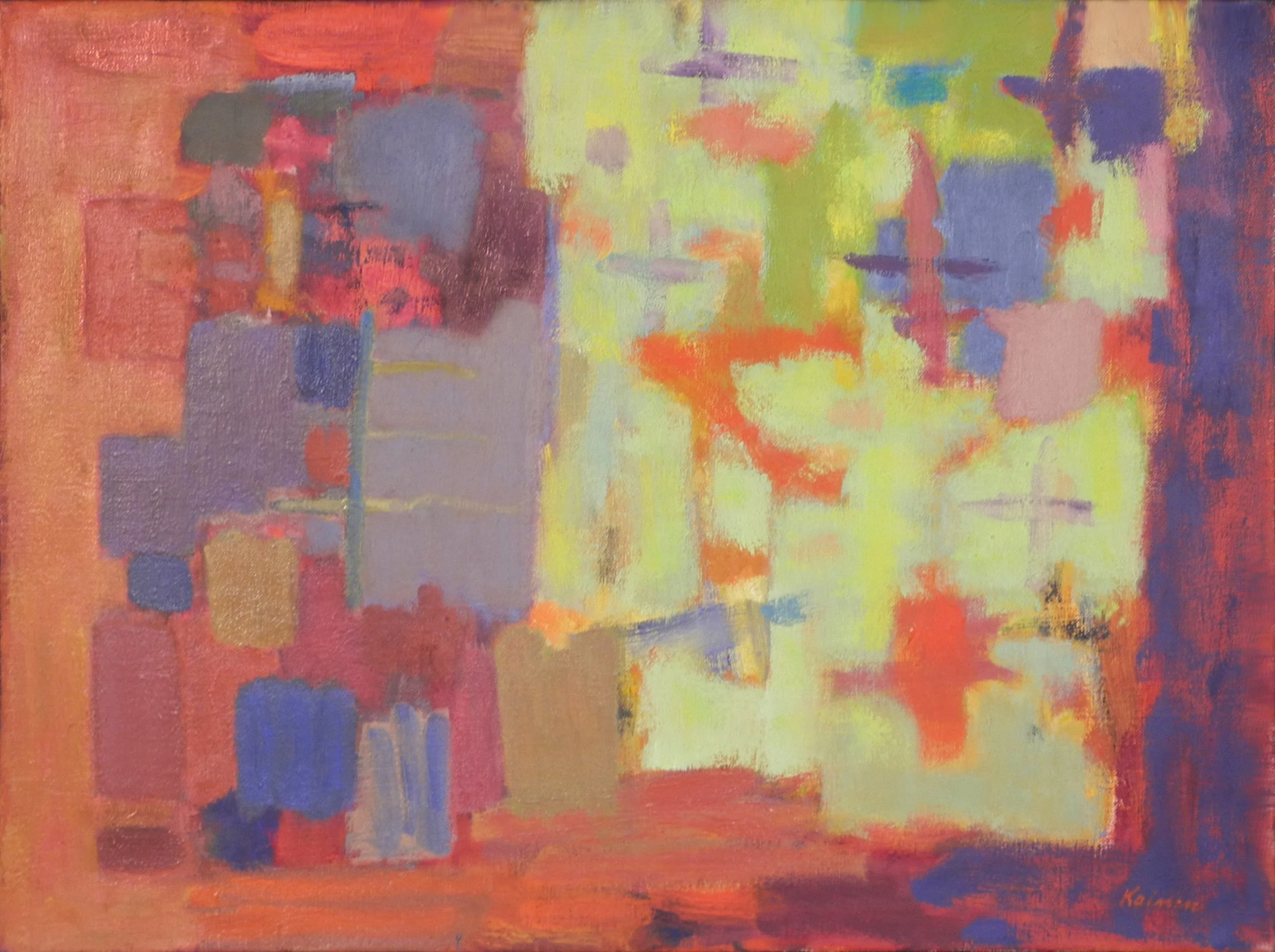 These are the first of Kainen’s works to substantially depart from the idea of a “protagonist shape”, creating harmonious ensembles of color, and, certainly in both “Rose and Gold,” 1956, and “Bright Stamboul,” 1957, shape itself is far less defined, appearing as strokes and areas, rather than distinct forms. “The Coming of Surprise,” 1951, is a jazz composition of dynamic shapes, and stroke-shapes, some larger, some smaller, but equal and inter-dependent, rather than a single, prominent entity. “Emerge and Shine,” 1955, has a prominent area of yellow, framing the red-orange shape within it, which takes pride of place, but is still not so much in tension with its surrounding strokes and slashes of color, as enhanced by them.