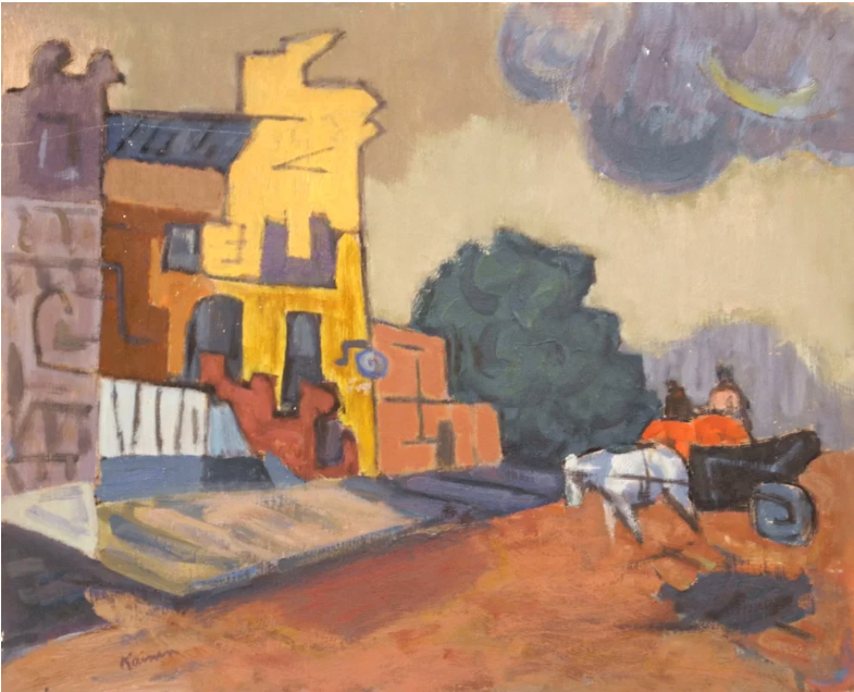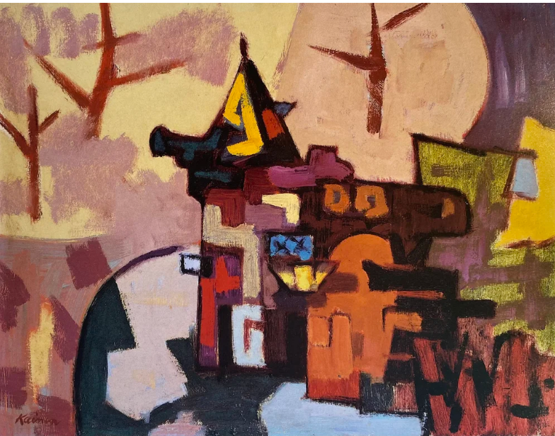 Aghast at the artistic backwater that was D.C. when he arrived (“it was like the Gobi desert”), nonetheless Kainen was intrigued with its Victorian architecture. Its townhouses, with their turrets, evoked what he called “threatening shapes”, and cleaner air and lower skyline created a different quality of light. As the 40’s progressed, Kainen’s work became more inventive in form and color as in “Side Street,” 1947, and then further abstracted in “Street Corner With Red Door,” also 1947. In “Central Park Lake,” 1948, representationalism is more due to the title of the piece than any other reason. His color remained tempered, with many secondary, rather than primary hues: yellow greens, aquas, violet-greys, muted blues and reds. They are very much his own colors, although they have been mistakenly thought to embody French and German influences. “Residential Facades,” 1948, is another good example of how he coined the visual phrase of his new surroundings.