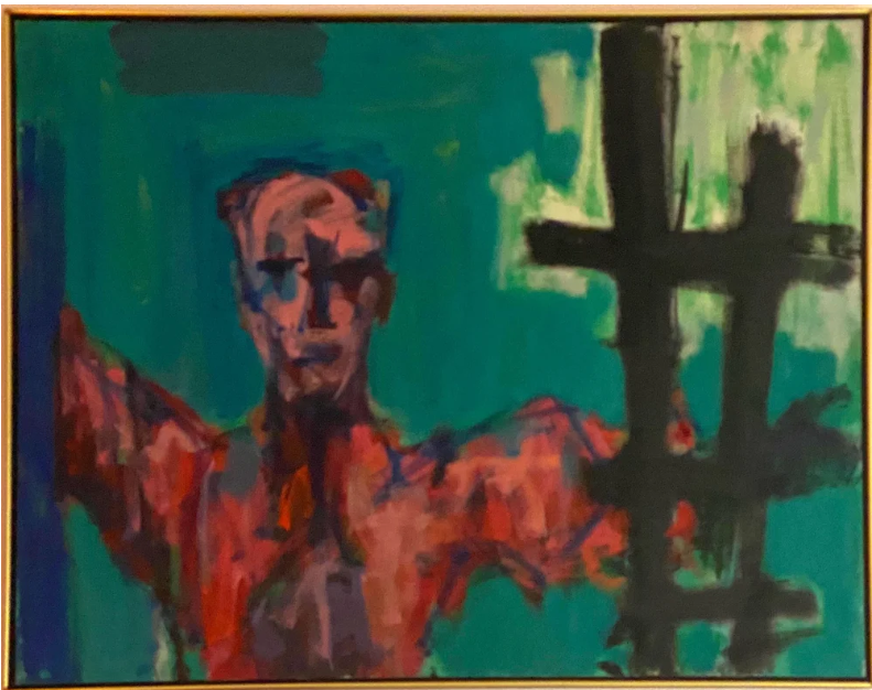 The 50’s were the McCarthy era, and Kainen was was told by friends on Capitol Hill that he was under investigation, since he had attended Communist meetings in the 30’s, as many New York artists in that time did. In addition, he was of Russian descent. an intellectual, and most importantly, worked for the Government so was a likely target. Therefore, he kept a low profile, preferring not to show, even as his old friends were becoming famous. His abstractions now reflected the troubled currents that threatened creative thought. In “Hour of the Beast”, 1953, a reference to Yeats’s poem, “The Second Coming”, and a veiled declaration of his contempt for McCarthy, a chimera-like beast is evoked from strong, sharp, dangerous-looking shapes. This painting was given first prize in an area show by none other than George Grosz, the German painter and expressionist. Less specific, yet sharing the same visual grammar, is “Marauder”, of 1951. Despite being highly abstracted, the forms in these paintings are evocative of a terrifying reality. This expressionist approach becomes figurative in “Stranger At the Gate,” 1957, with a human figure whose nature seems to alternate between threat and vulnerability. The figure itself, in pinks and reds, is lacerated-looking, reminiscent of Rembrandt’s “Flayed Ox,” which Kainen had seen a few years before on his first trip to Europe in ‘56. The color is intense, and the composition strong; the figure on the left, as well as notes of color also at the far, and upper left, balance the powerful, black bars of the gate on the right. “Witness II,” 1950, is one of the only paintings that shows an influence of Kainen’s mentor, Arshile Gorky.